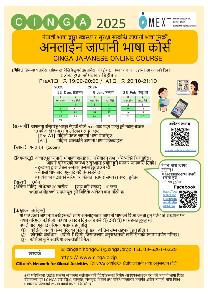 CINGA地域日本語研究チームでは、ネパール語話者のためのオンラインによる日本語コースを実施します。