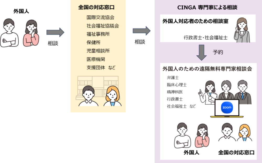 CINGAの専門家相談は、外国人相談に取り組んでおられる全国の国際交流協会、福祉事務所、社会福祉協議会、保健所、行政、外国人支援団体などの担当者が外国人の在留資格や対応のことで困ったときに相談できる2つの事業を行っていています。