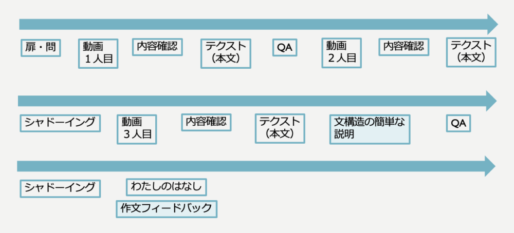 ひとつのユニットには3人分のストーリーがあります。ですので、3人分のストーリーを理解した後のタイミングで、キーとなる文の構造の簡単な説明をしていました。