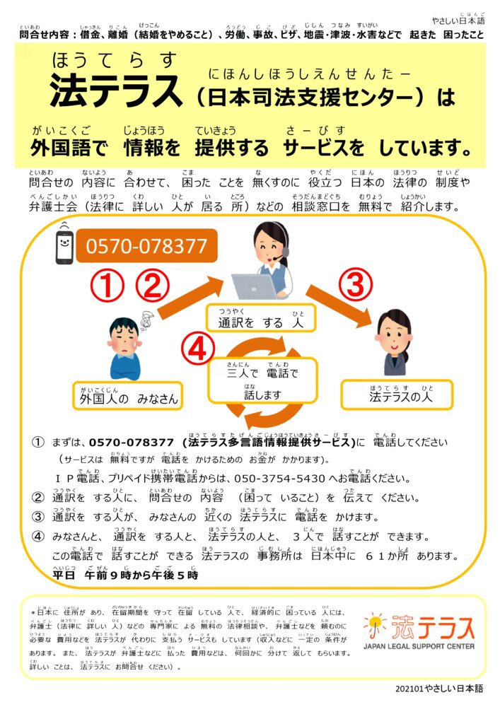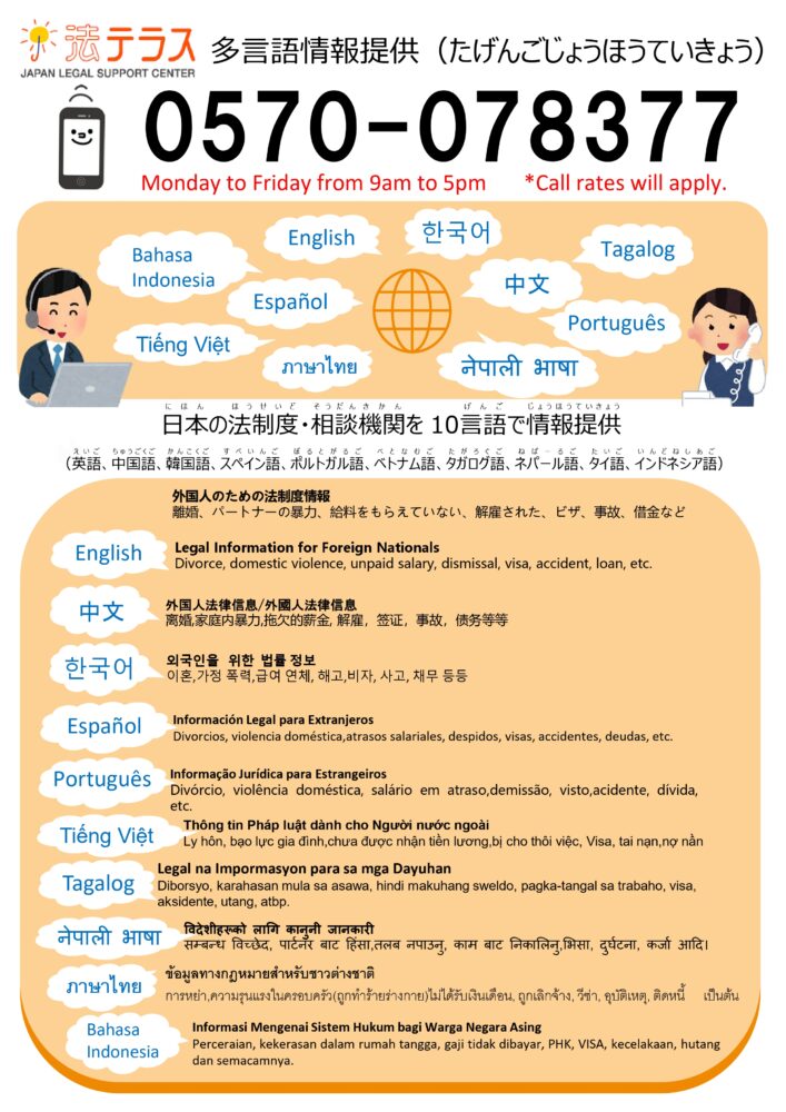 17. 法テラス(日本司法支援センター)は外国語で情報を提供するサービスをしています。